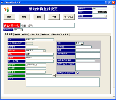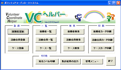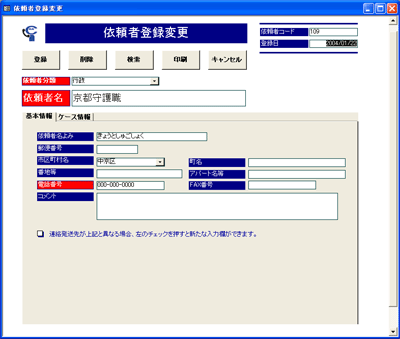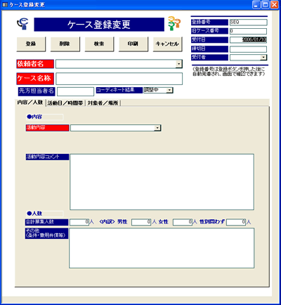 依頼者、活動会員、ケースの登録用紙印刷、宛名ラベル印刷などができます。 |